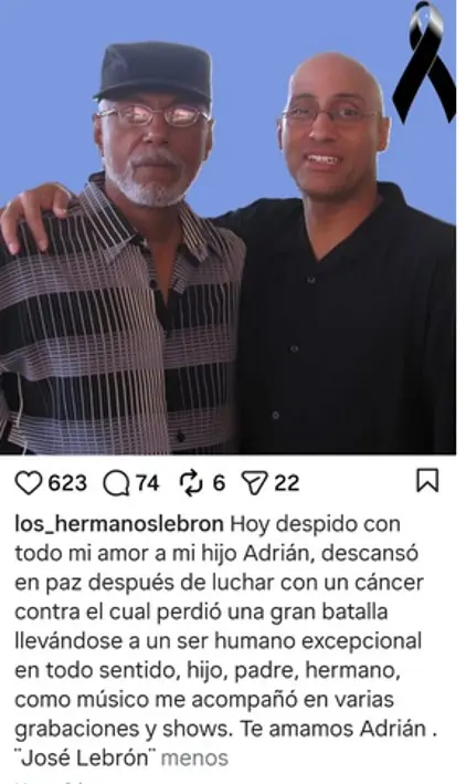 Minuto30.com .- El mundo de la salsa y la familia de los Hermanos Lebrón están de luto. A través de un emotivo mensaje en sus redes sociales oficiales, el maestro José Lebrón confirmó el sensible fallecimiento de su hijo, Adrián Lebrón, quien libró una dura batalla contra el cáncer en los últimos meses.