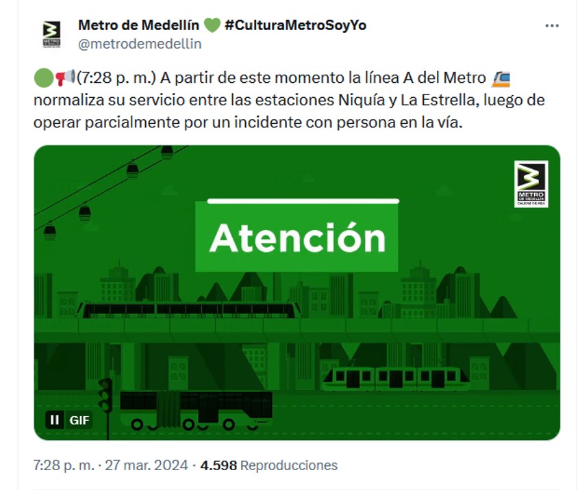 Minuto30.com .- Luego de hora y media suspendido la operación del metro en las estaciones del norte del Valle de Aburrá, el servicio se normaliza.