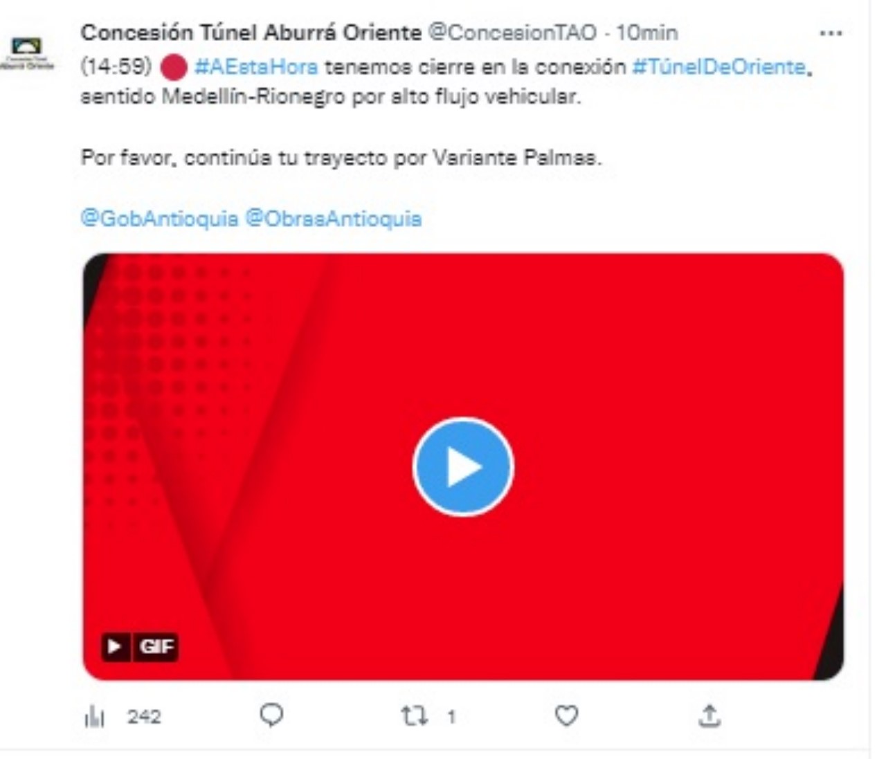 Por medio de la cuenta de Twitter de la Concesión Túnel Aburrá Oriente detallaron a las 2:59 de la tarde que hay cierre debido al alto flujo vehicular.