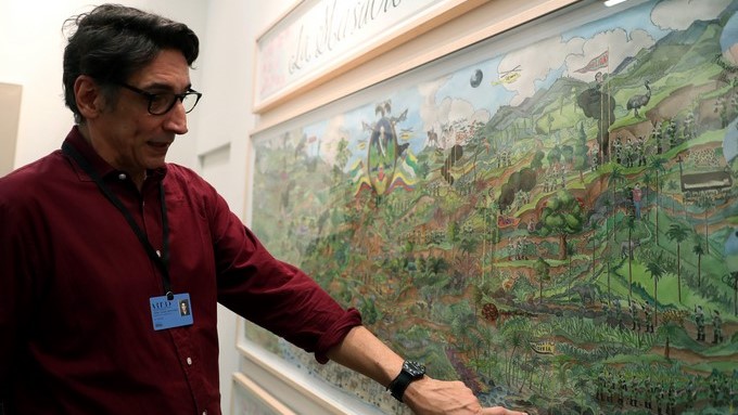 “Esto demora mucho tiempo, por lo menos esta es una obra de seis meses de trabajo”, detalló el artista mientras enseñaba a los asistentes a ARTBO su cuadro “La masacre de El Aro”, perpetrada por paramilitares en 1997.