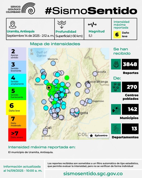 Minuto30.com .- El Servicio Geológico Colombiano confirmó que el sismo de magnitud 5.1 con epicentro en Uramita, Antioquia, que se registró a las 2:12 a. m. de este domingo, fue sentido en 13 departamentos y 142 municipios del país. La información se obtuvo gracias a los 3.848 reportes enviados por la comunidad.