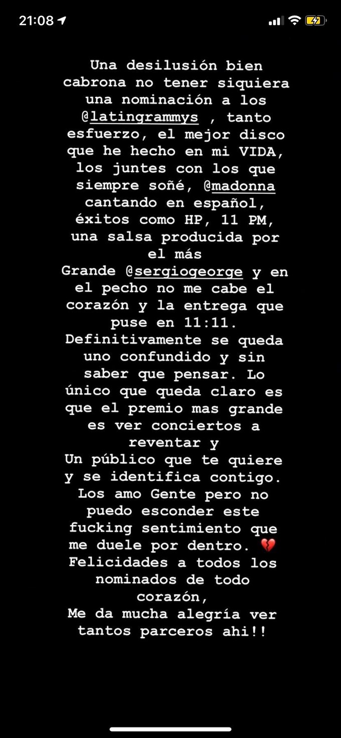 El paisa inició diciendo que: “Una desilusión bien cabrona no tener siquiera una nominación a los Latin Grammys. Tanto esfuerzo, el mejor disco que he hecho en mi vida”.