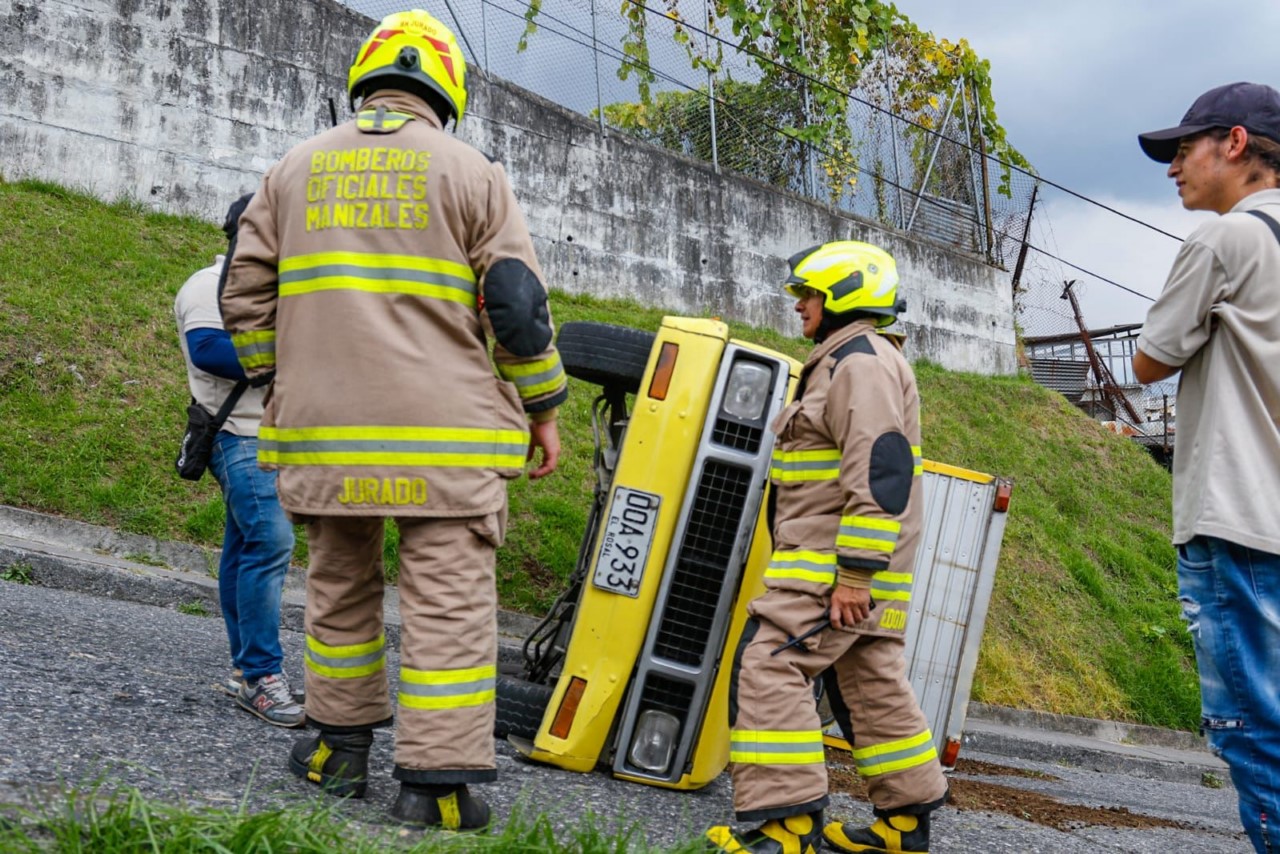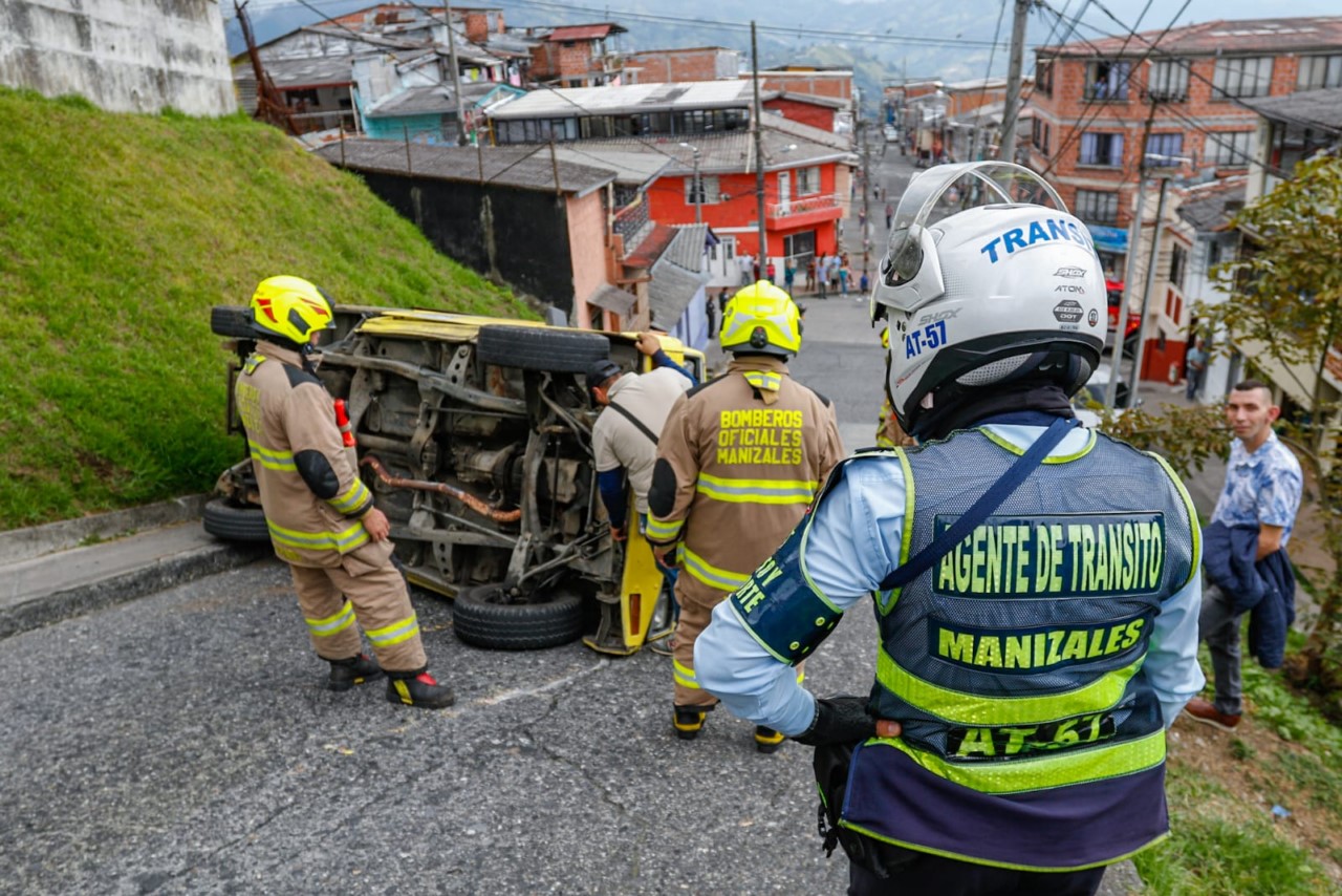 El Cuerpo Oficial de Bomberos Manizales atiende el volcamiento de un vehículo en la calle 17 con carrera 28, en el cual se movilizaban dos personas, quienes, sin embargo, no presentaron lesiones.