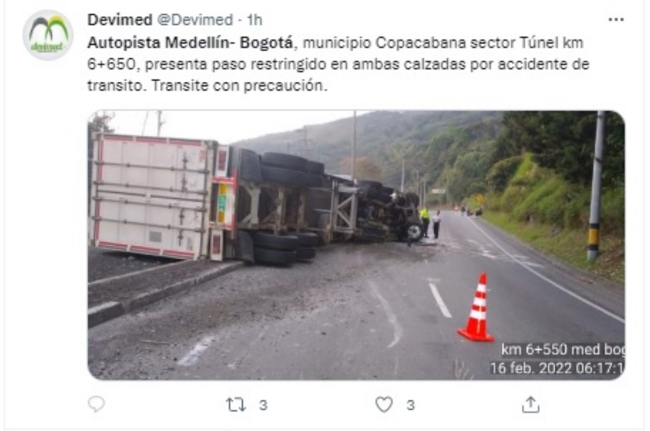 Autopista Medellín- Bogotá, municipio Copacabana sector Túnel km 6+650, presenta paso restringido en ambas calzadas por accidente de tránsito. Transite con precaución”, se puede leer en el trino.