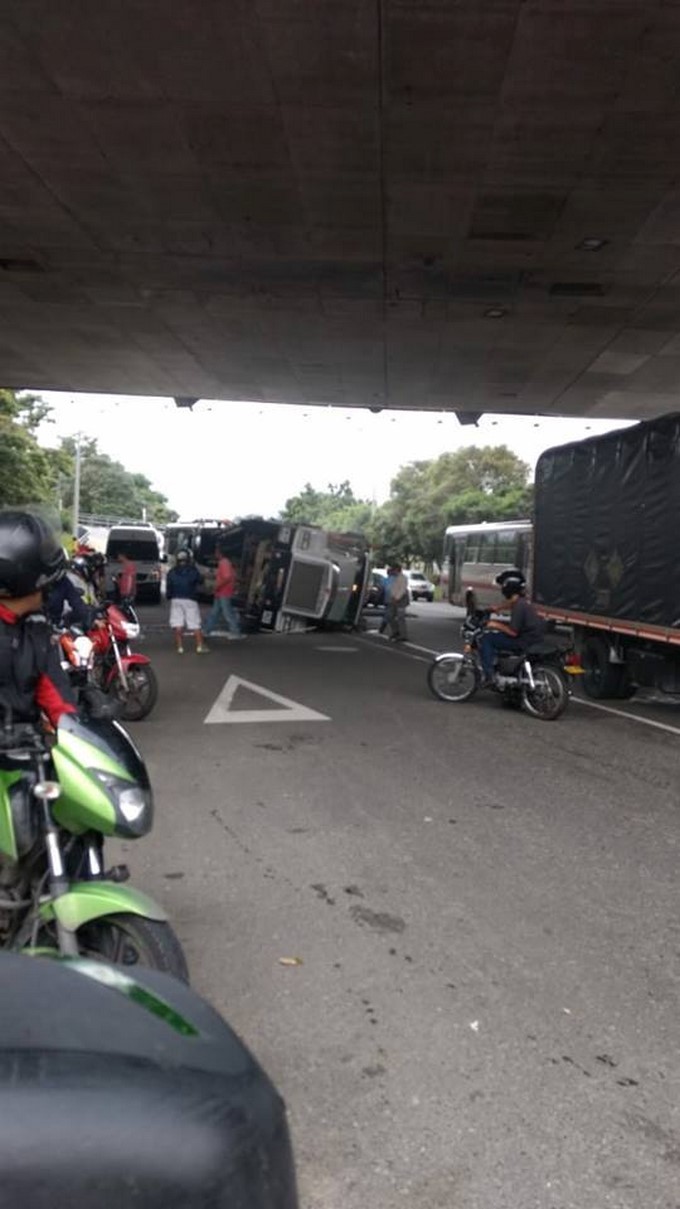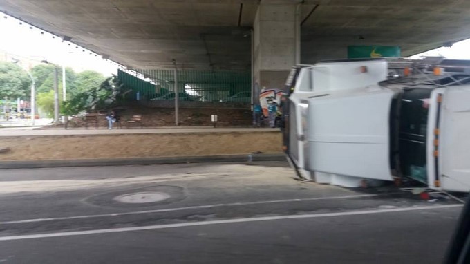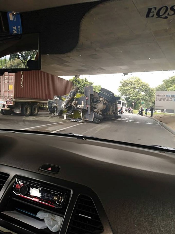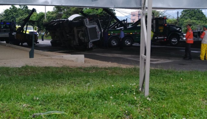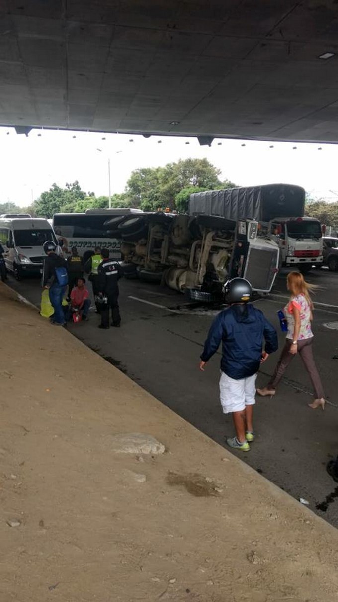 Según el reporte a la altura del puente de la 4 sur un vehículo que trasportaba cemento perdió el control y se volcó.