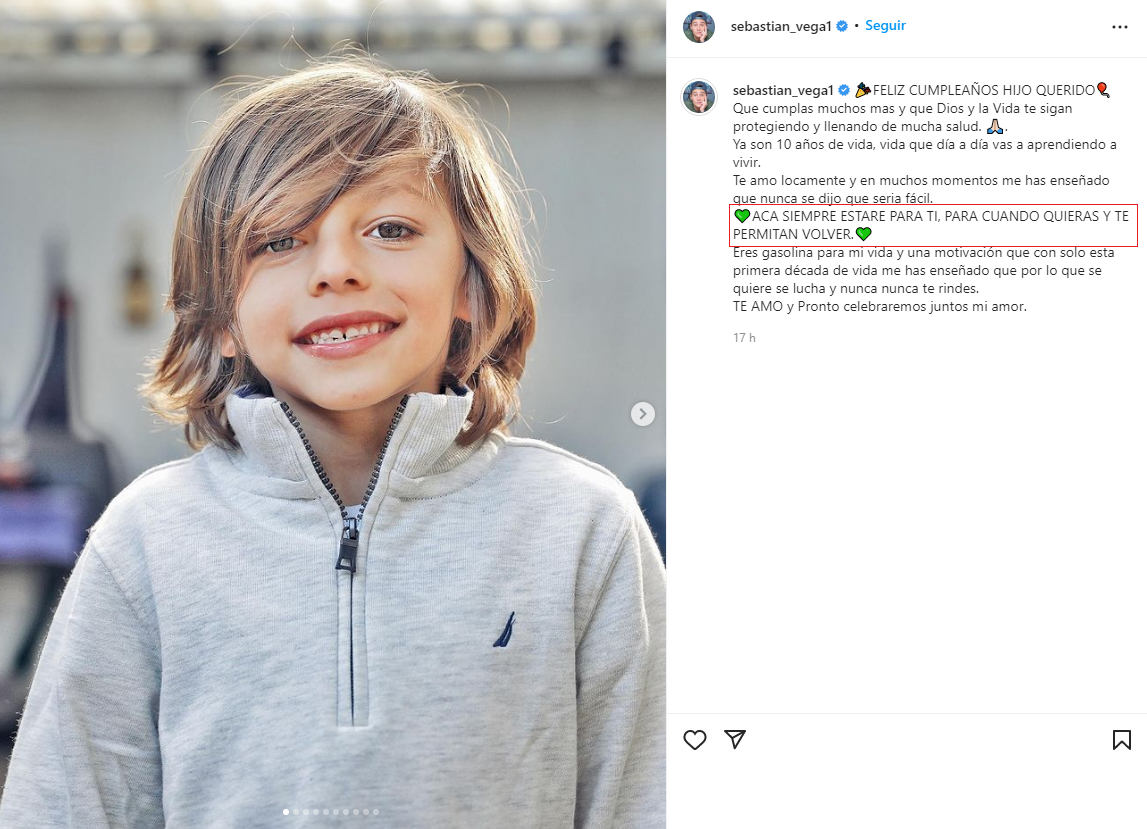 Vega utilizó su Instagram para felicitar a su hijo Matías por su cumpleaños y en el mensaje afirmó: “ACA SIEMPRE ESTARE PARA TI, PARA CUANDO QUIERAS Y TE PERMITAN VOLVER”, mensaje que ha revolucionado a sus seguidores y los ha hecho opinar ante la situación.
