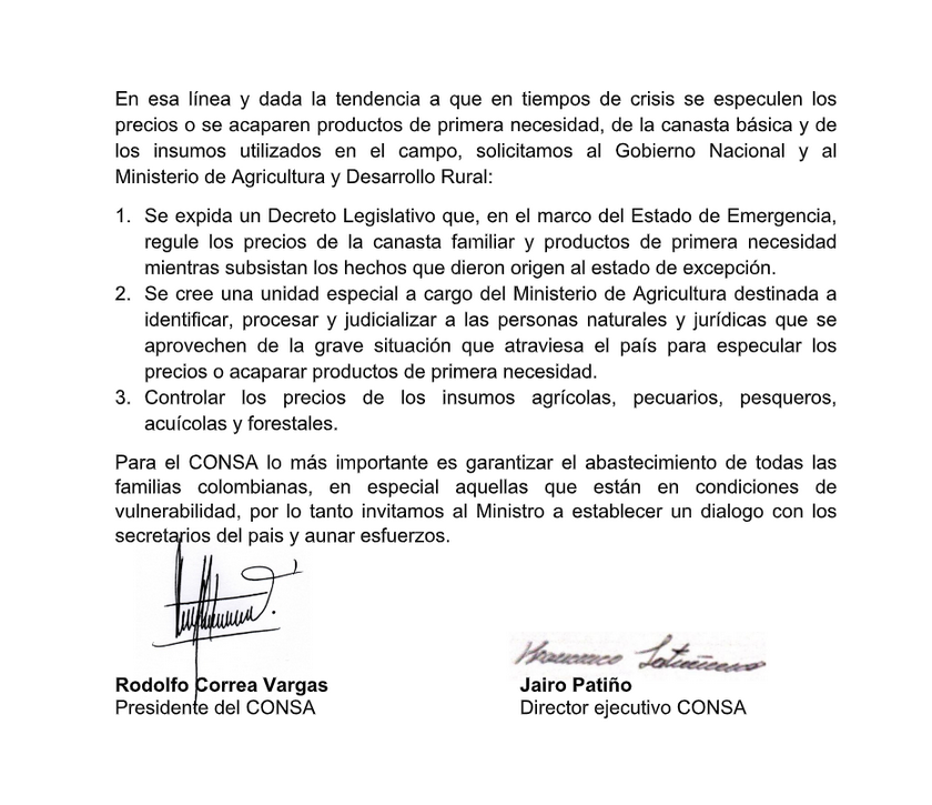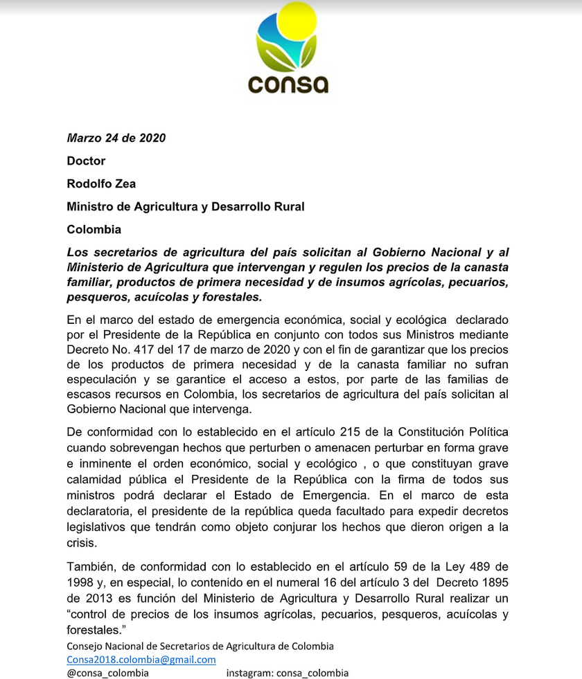 El Consejo Nacional de Secretarios de Agricultura de Colombia (CONSA) le solicitó al Gobierno Nacional que a través del Ministerio de Agricultura intervenga y regule los precios de la canasta familiar y de primera necesidad, esto para evitar que sufran algún aumento desmedido y así garantizar el acceso a estos para las familias de escasos recursos durante la cuarentena.