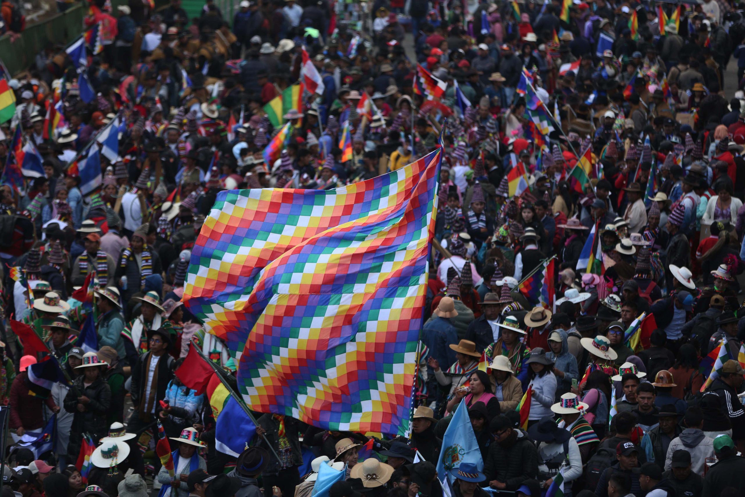 Las banderas azules con blanco y negro características del partido oficialista del MAS flamearon al igual que las wiphalas, la multicolor indígena, en medio de la multitud de movimientos sociales e indígenas que llegaron desde distintos puntos del país para participar de esta reunión.