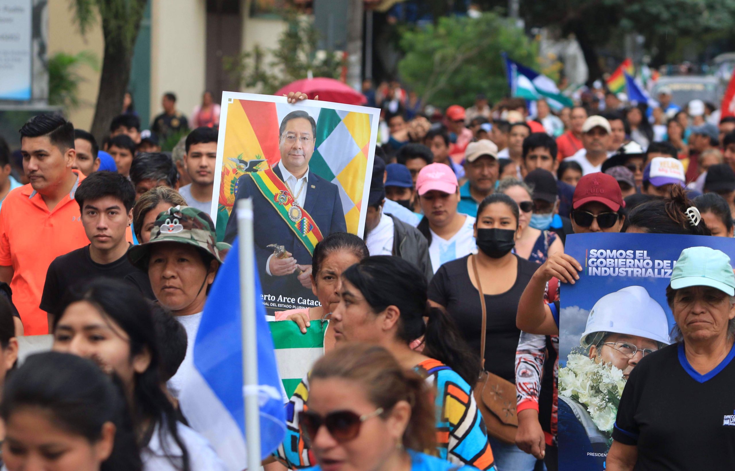 Decenas de personas se concentraron en la ciudad de Santa Cruz con banderas con los colores azul, negro y blanco del oficialista Movimiento al Socialismo (MAS) y carteles con mensajes que mostraban su apoyo a la gestión de Arce, en medio de la división interna en el partido gobernante entre "arcistas" y "evistas".