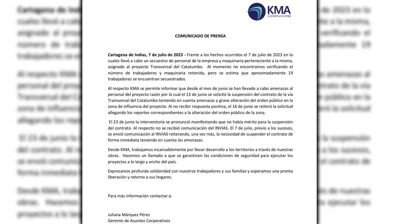 Después de conocerse esta información por parte de la empresa, Juliana Márquez, Gerente de Asuntos Corporativos de KMA, le confirmó que acaban de ser liberados 13 de los trabajadores. Aún estarían secuestradas 6 personas y la maquinaria de la empresa.