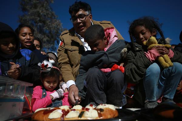 “Este día el Colectivo Ángeles Mensajeros decidimos compartir con nuestros hermanos migrantes, con nuestros hermanos venezolanos, un pedacito de la rosca de reyes que simboliza la vista de los reyes al niño peregrino Jesús de Nazareth”, dijo Carlos Mayorga, director del grupo religioso apostado a un lado del Rio Bravo.