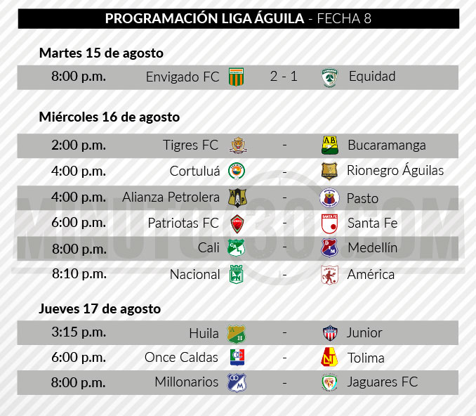 Con el triunfo de Envigado 2-1 sobre La Equidad, se abrió la octava fecha de la Liga Águila II-20017, que este miércoles tendrá seis partidos y el jueves se completará con tres juegos más.