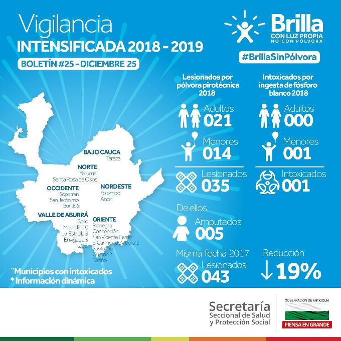 Minuto30.com .- Según reporte oficial de la Secretaría Seccional de Salud y Protección Social de Antioquia, este 24 de diciembre se registraron seis nuevos casos de lesionados con pólvora, de ellos dos son menores de edad. Y dos de los lesionados sufrieron amputación