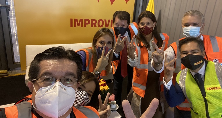 El presidente de la República Iván Duque y el ministro de salud- Fernando Ruiz- celebraron con una selfie la llegada de las 50 mil dosis de vacunas de Pfizer al país.