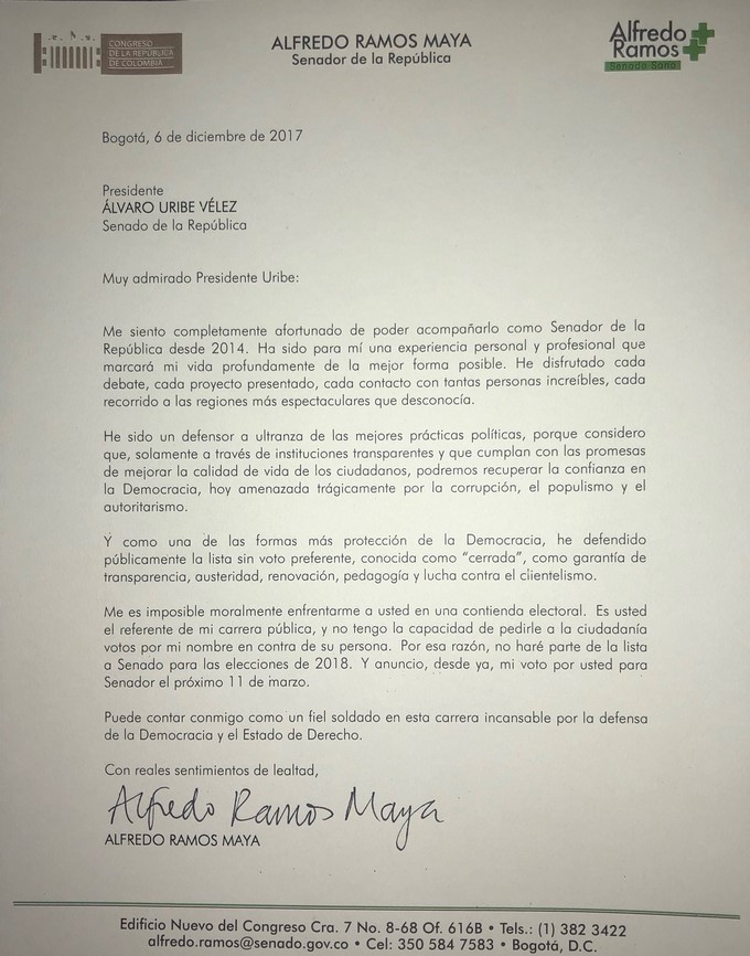 El senador Alfredo Ramos Maya, quien obtuvo su curul en las pasadas elecciones a través de la lista “cerrada” del Centro Democrático, expresó a través de una carta que declina a participar de los próximos comicios.