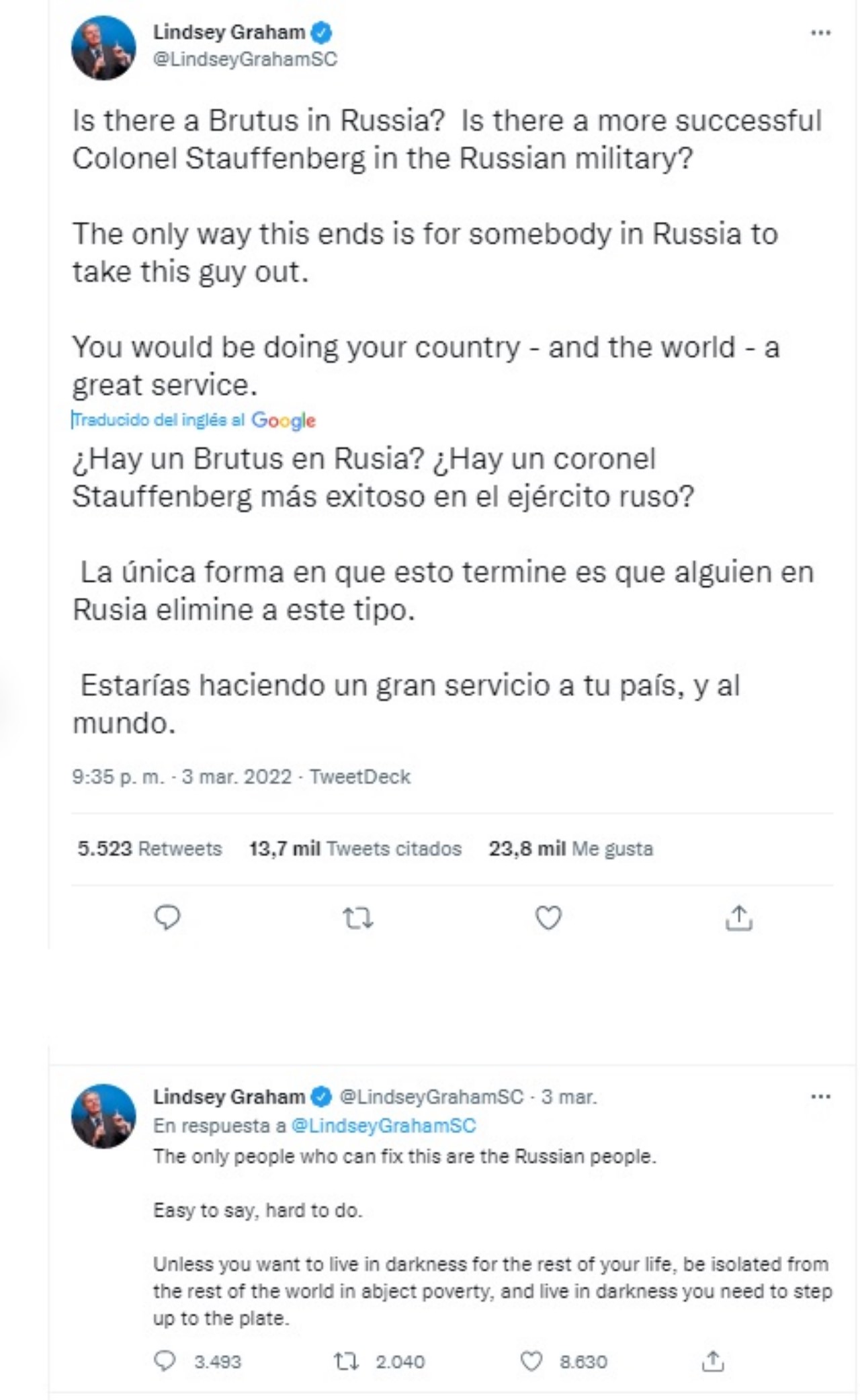El senador de Estados Unidos Lindsey Graham pidió que los rusos maten a Vladimir Putin. El republicano de Carolina del Sur que fue abogado de la Fuerza Aérea de Estados Unidos y desde 2003 ocupa una banca en el Senado despertó polémica luego de sus declaraciones contra el presidente de Rusia.