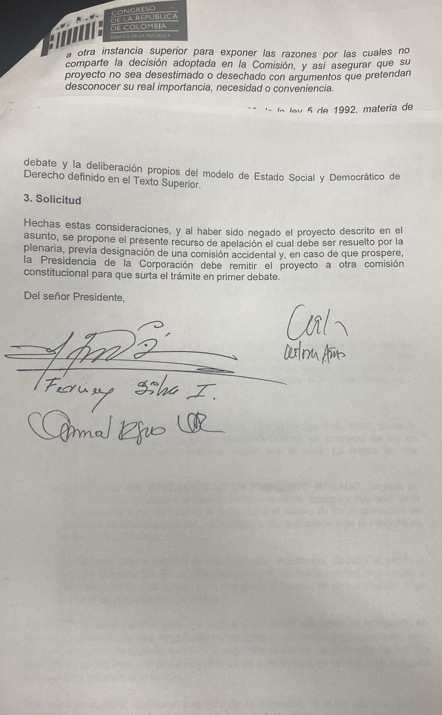 La ponencia había sido firmada el pasado 12 de marzo por los senadores Lorena Ríos, del partido Colombia Justa Libres; Honorio Henríquez y Alirio Barrera, del Centro Democrático; Nadia Biel Scaff y José Marín del Conservador; Miguel Pinto del Partido Liberal; Berenice Bedoya de la Alianza Social Indígena; y Norma Hurtado del Partido de la U.