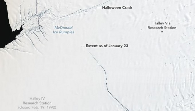 En su anuncio la NASA comparó una fotografía de esa zona, realizada desde el satélite Landsat, fechada en enero de 1986 con otra de enero de 2019 donde se aprecia una grieta que cruza de oeste a este toda la parte que previsiblemente se desprenderá, y cuya forma es la de un cabo costero.