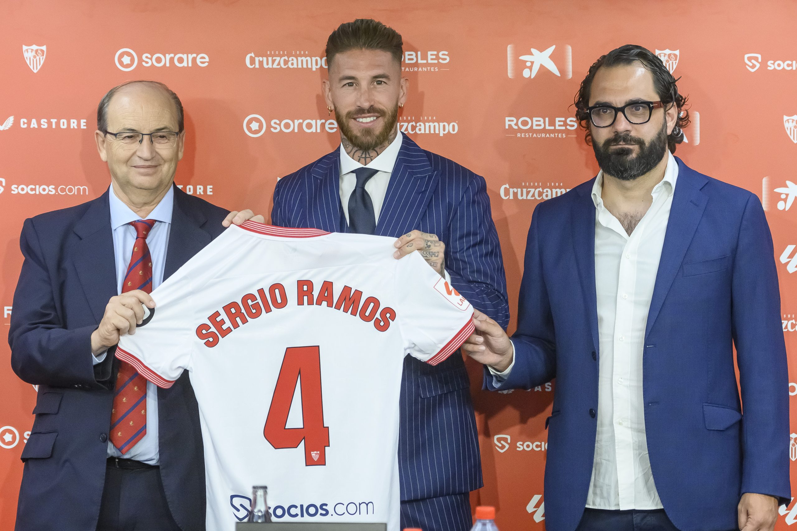 Acompañado por el presidente sevillista, José Castro, su director deportivo, Víctor Orta, y sus familiares, entre ellos su esposa, Pilar Rubio, y sus cuatro hijos, y antes de saltar al césped en un acto público, Ramos dijo en una multitudinaria rueda de prensa que "hoy es un día inolvidable, emocionante" y que quiere "enmarcar", ya que "es un tema muy sentimental" poder volver a su "casa", "cerrar un ciclo" y reforzar "ese vínculo que desde niño" ha tenido "con la afición y el club" que le vieron "nacer".