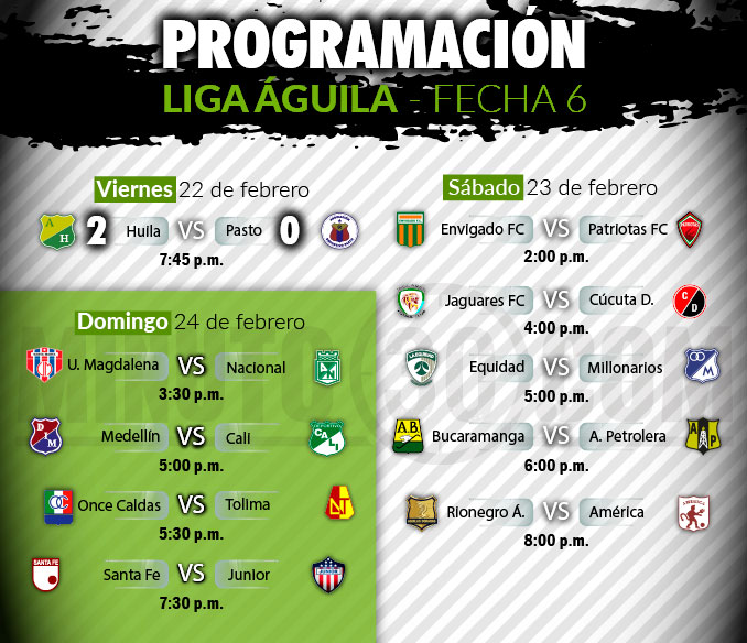 Y es que la programación dominical se torna atractiva en su totalidad, de cuenta de los enfrentamientos entre Independiente Medellín y Cali (5:00 p.m.), Once Caldas – Deportes Tolima (5:30 p.m.) y Santa Fe – Junior (7:30 p.m.).