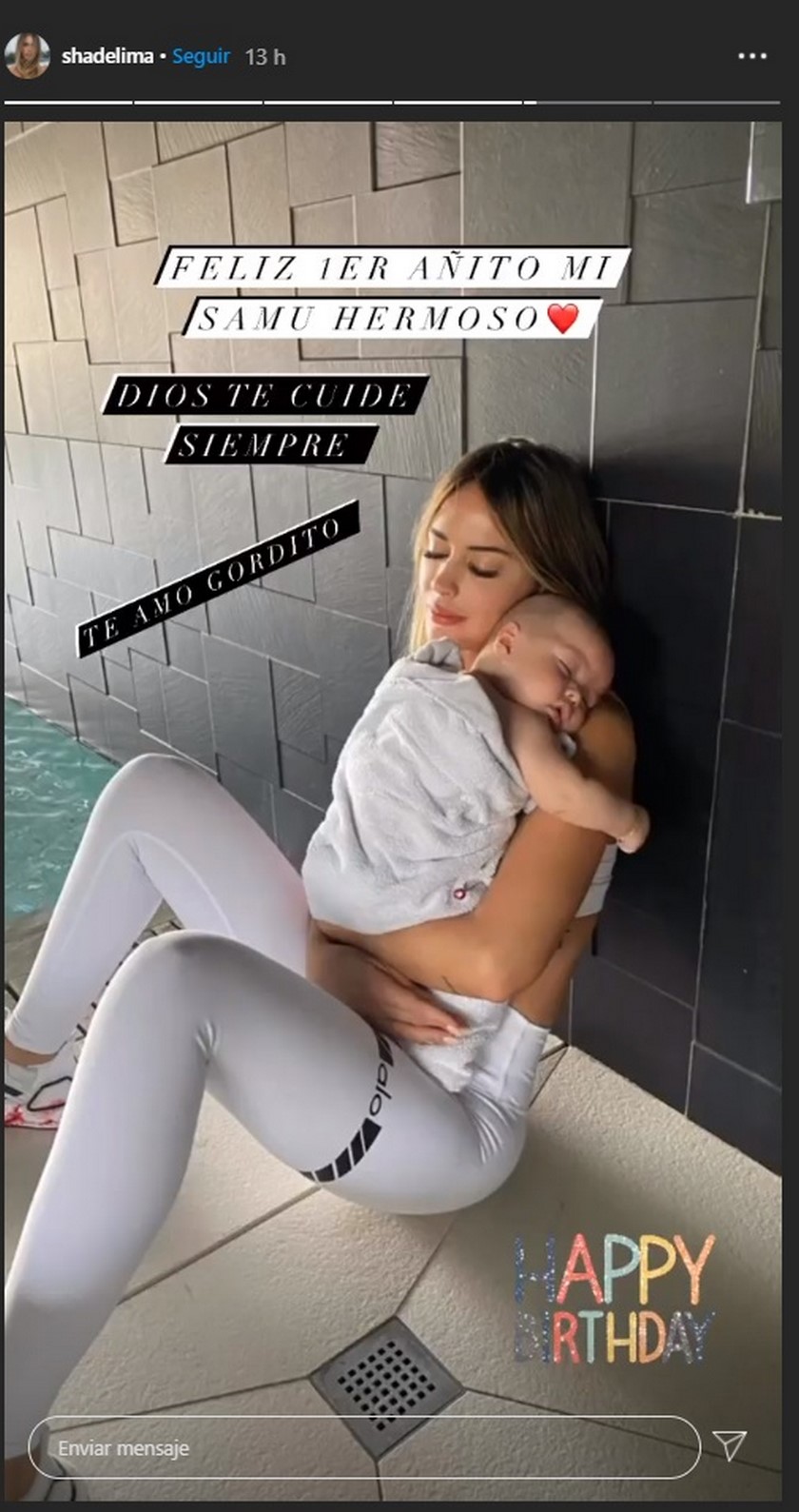 Con una foto en la que sale Shannon cargando a Samuel mientras él estaba envuelto en una toalla lo felicitó por su primer año, “feliz primer añito mi ‘Samu’ hermoso. Dios te cuide siempre. Te amo gordito”.