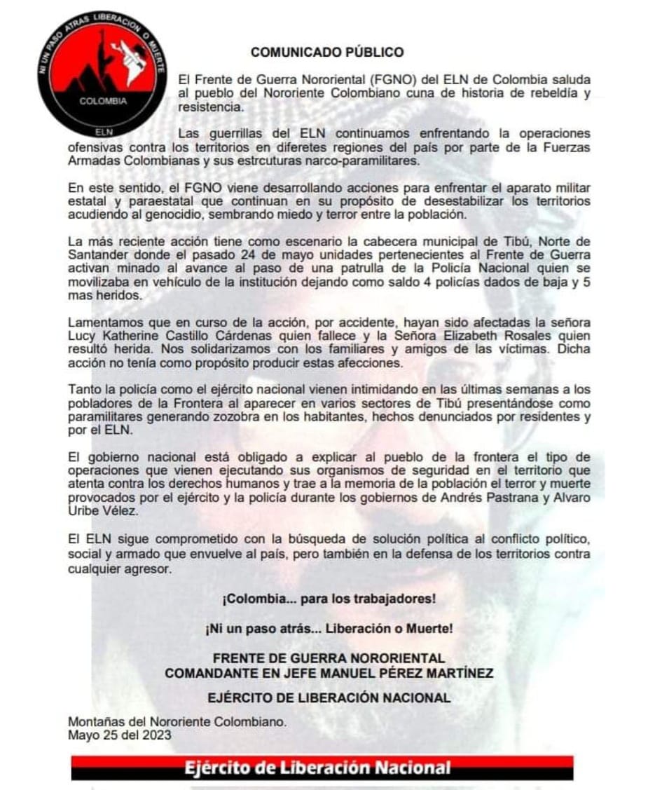En un comunicado el Ejército de Liberación Nacional -ELN- se adjudicó la autoría del atentado terrorista en Tibú, Norte de Santander y en el que murieron dos policías y una civil.