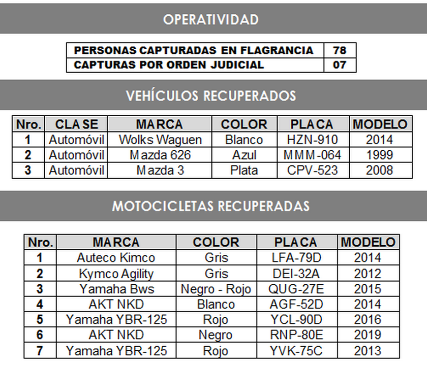 En las acciones y operaciones en contra el hurto en el territorio del Valle de Aburrá, fueron recuperadas 7 motocicletas y 3 carros, y las autoridades dieron a conocer las placas de estos vehículos.