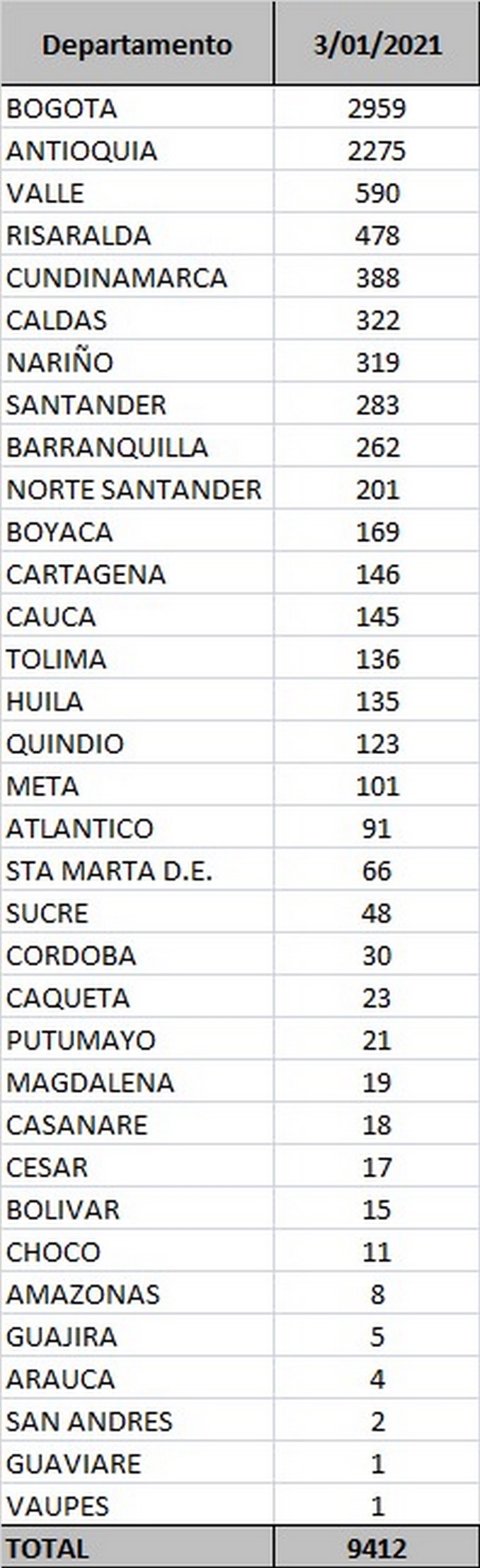 Este es el reporte oficial de Covid-19 para este 3 de enero en Colombia: