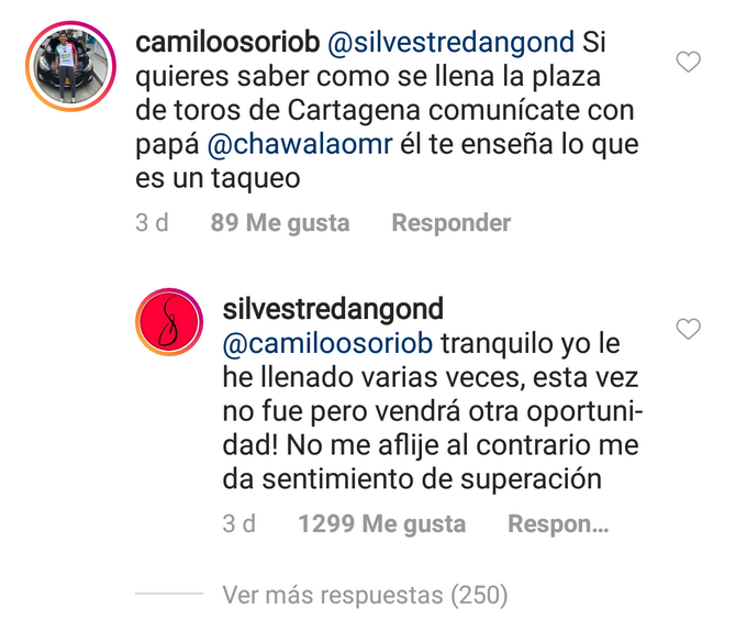 Ante esto, el cantante le salió al ruedo y no se quedó callado, contándole que se sentía tranquilo: “yo le he llenado varias veces. Esta vez no fue pero vendrá otra oportunidad. No me aflige, al contrario, me da sentimiento de superación”. El comentario del artista hizo que sus reales seguidores lo apoyaran, incluso, algunos fueron más allá y le dijeron que le pueden preguntar a Silvestre cómo se llena el Madison Square Garden, escenario estadounidense donde Dangond ya se presentó y llenó por completo.