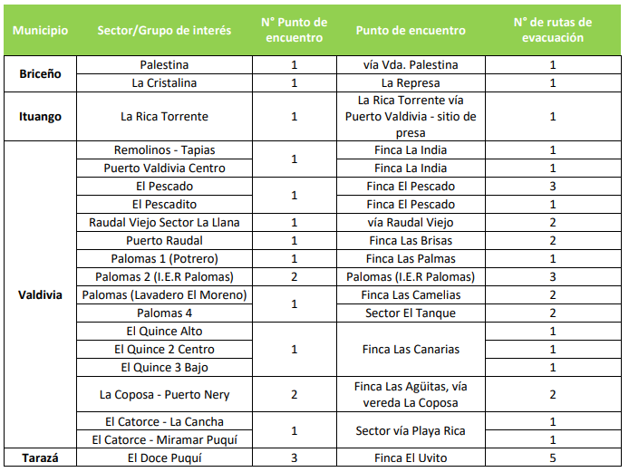 de las comunidades ribereñas entre Puerto Valdivia y la comunidad el Doce de Tarazá para quienes se tendrán habilitados 20 puntos de encuentro, así: