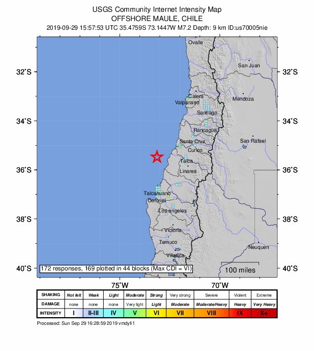 El movimiento telúrico se registró a las 12:57 hora local (15:36 GMT) y su epicentro se localizó a 70 km al oeste de Constitución, ciudad de la región del Maule ubicada a unos 370 kilómetros al sur de Santiago, informó el Centro Sismológico Nacional.