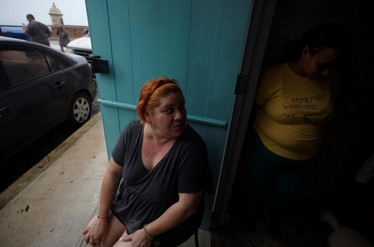 Joeni Rodríguez se reúne con sus vecinos en la puerta de su casa, tras quedarse sin luz por el paso del huracán Fiona hoy, en San Juan (Puerto Rico). EFE/Thais Llorca