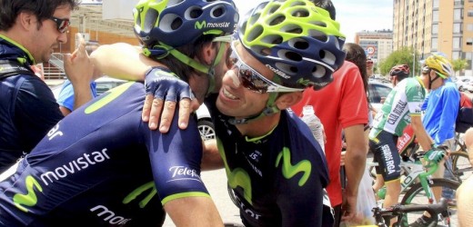 El ciclista Ion Izaguirre (d), del Movistar, se abraza a su compañero de equipo Alejandro Valverde (i). EFE/Archivo