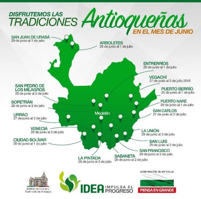 Durante este fin de semana un total de 17 municipios de las diferentes subregiones de Antioquia llevarán a cabo sus celebraciones tradicionales con una variada programación artística y cultural que promueve el talento local, el rescate de las tradiciones y propicia en intercambio con los turistas y visitantes.