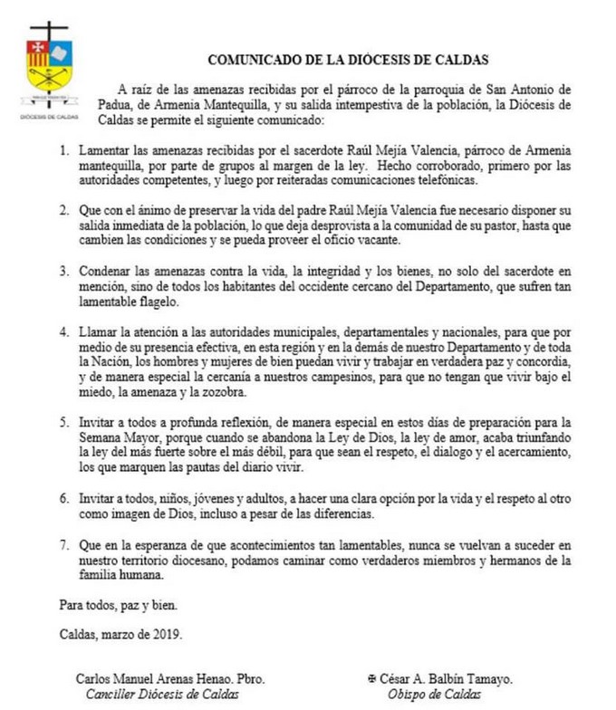 Por medio de un comunicado la Diócesis de Caldas, Antioquia, dijo que fue necesaria la salida de Raúl Mejía Valencia de la parroquia San Antonio de Padua del municipio de Armenia Mantequilla, ubicado en el occidente de Antioquia, con el ánimo de preservar la vida del párroco.