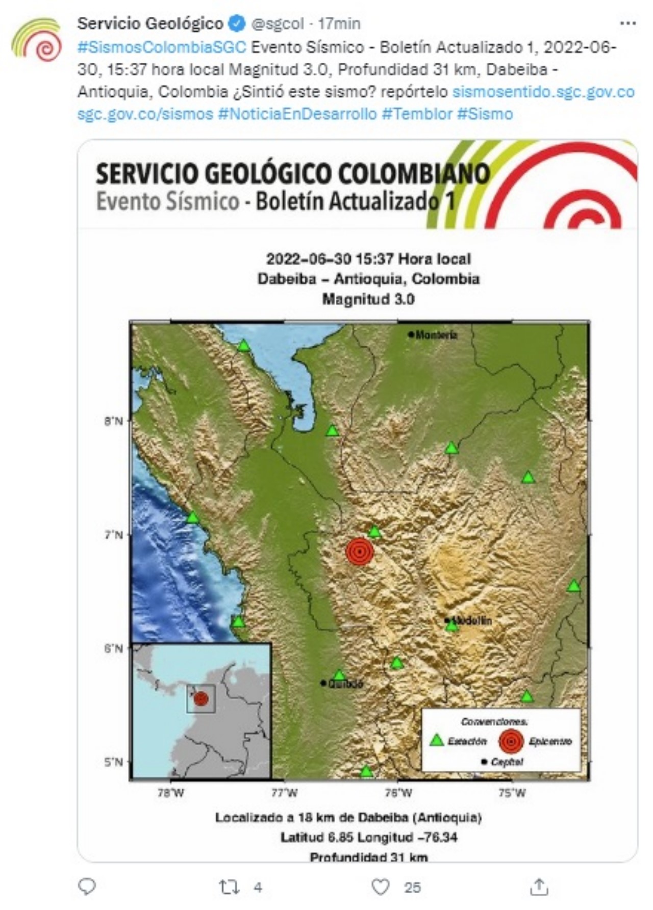 El Servicio Geológico Colombiano detalló en su cuenta de Twitter que en la tarde de este jueves se presentó un sismo que se sintió en Occidente del departamento de Antioquia.