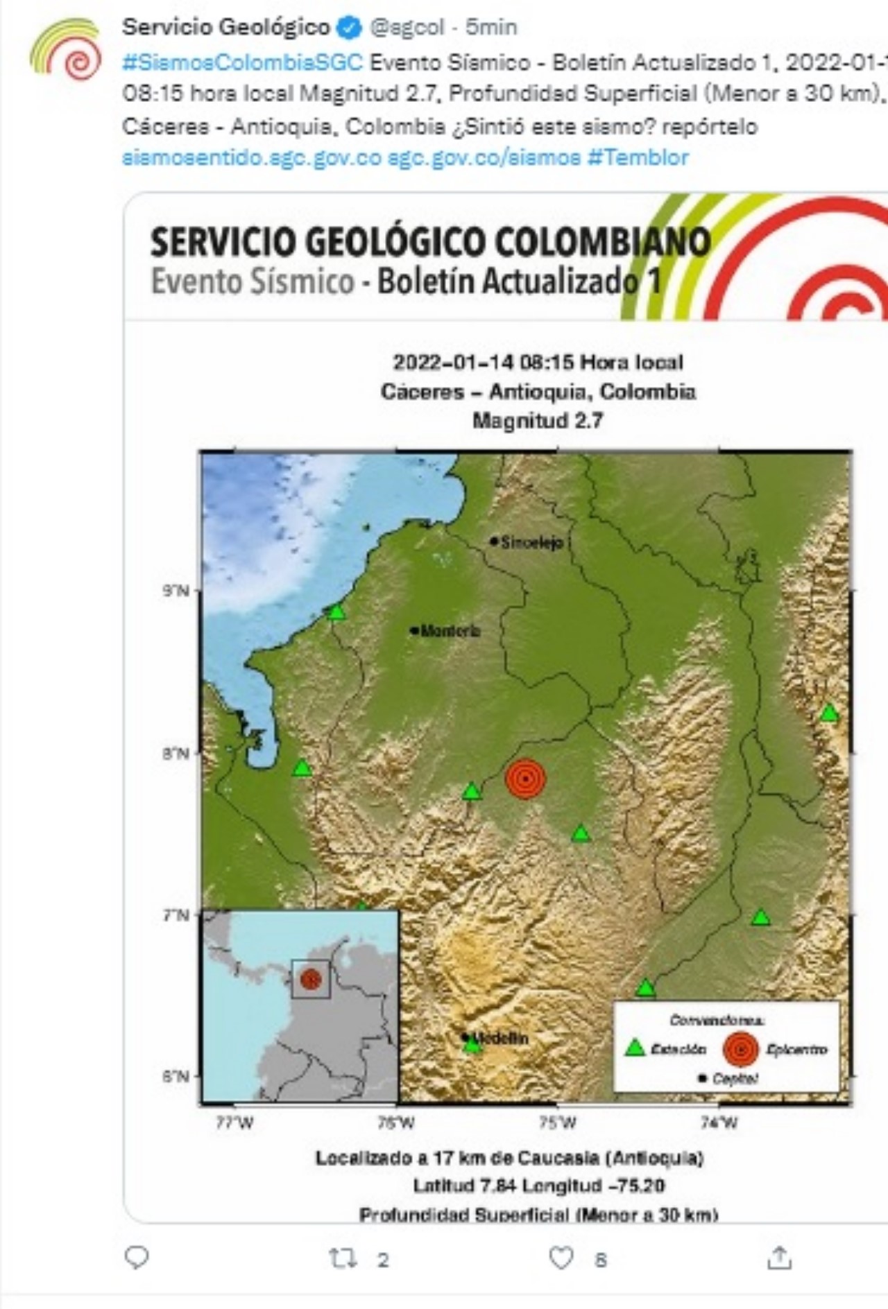 El movimiento telúrico tuvo una Magnitud 2.7, Profundidad menor a 30 km, en Cáceres – Antioquia, Colombia.
