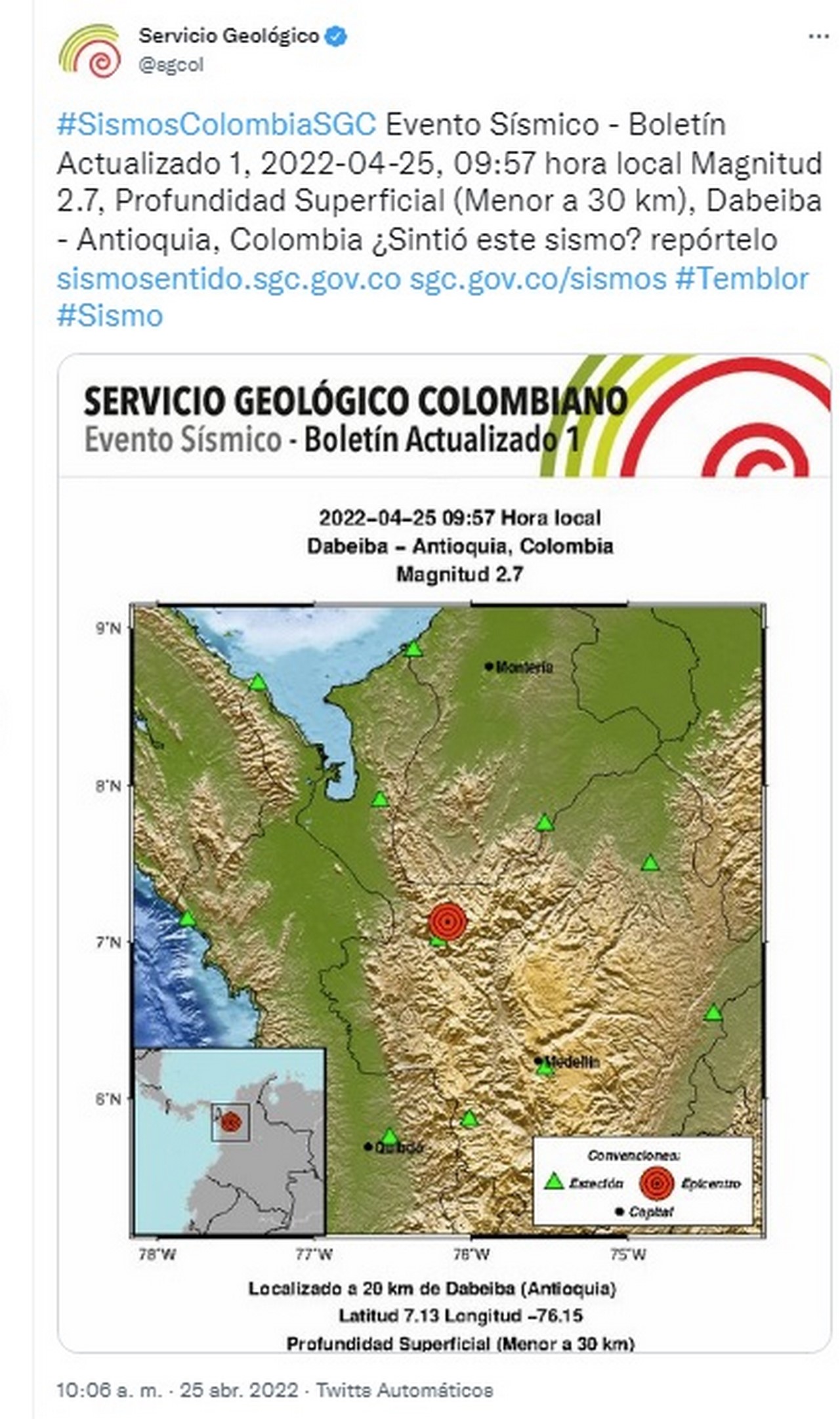 En la mañana de este lunes 25 de abril algunos habitantes del municipio de Dabeiba – Antioquia – sintieron un leve temblor.