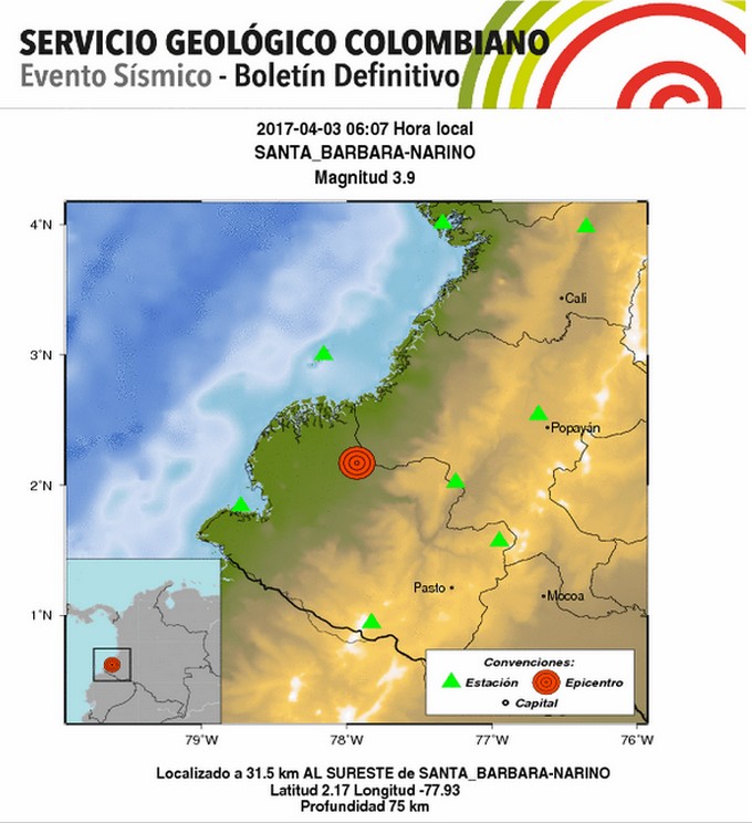A las 6:07 de la mañana de este martes se presentó un movimiento telúrico de magnitud 3.9 grados en la escala de Richter y tuvo como epicentro al municipio de Santa Bárbara en el departamento de Nariño.