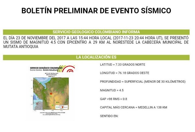 El epicentro del movimiento telúrico que registró 4. 5 en la escala Richter, estuvo ubicado en el municipio de Mutatá.