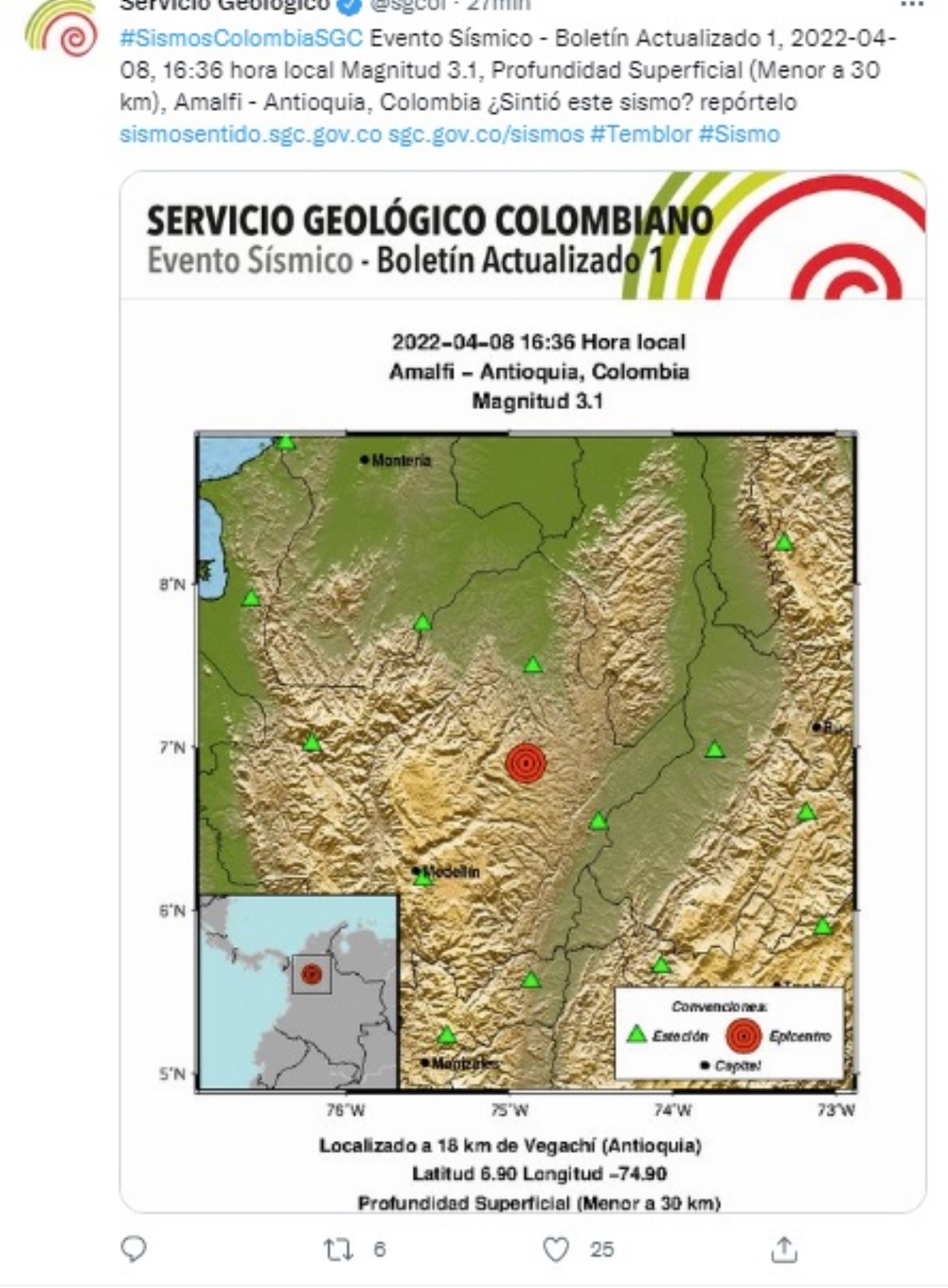 El sismo ocurrió a la 4:36 de la tarde, el temblor tuvo una Magnitud 3.1, Profundidad Superficial (Menor a 30 km), Amalfi – Antioquia, Colombia.