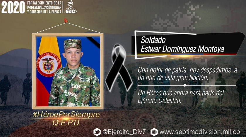 Llevamos en la memoria la valentía de nuestro soldado Estwar Domínguez Montoya, que ofrendó la vida protegiendo a la población del #Chocó. Su sacrificio nos compromete a seguir trabajando por la seguridad de este departamento. Mi solidaridad con su familia. #HéroePorSiempre pic.twitter.com/L1Hc0p3rn8