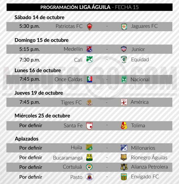 Entre tanto, el domingo, Independiente Medellín recibirá a Atlético Junior (5:15 en el Atanasio Girardot; mientras que Deportivo Cali se medirá con La Equidad (7:30 p.m.) en Palmaseca.