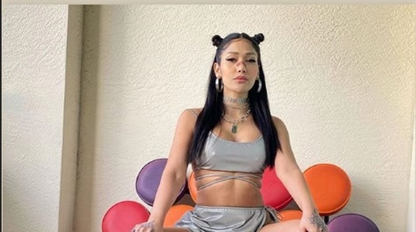 Con el pantalón mostró sus caderas y se podía ver que no estaba llevando nada por debajo, sin cucos Farina posó al frente de la cámara con su cabello recogido en dos moños altos y un llamativo maquillaje del mismo color de la prenda, así como toda una ‘gatúbela’.