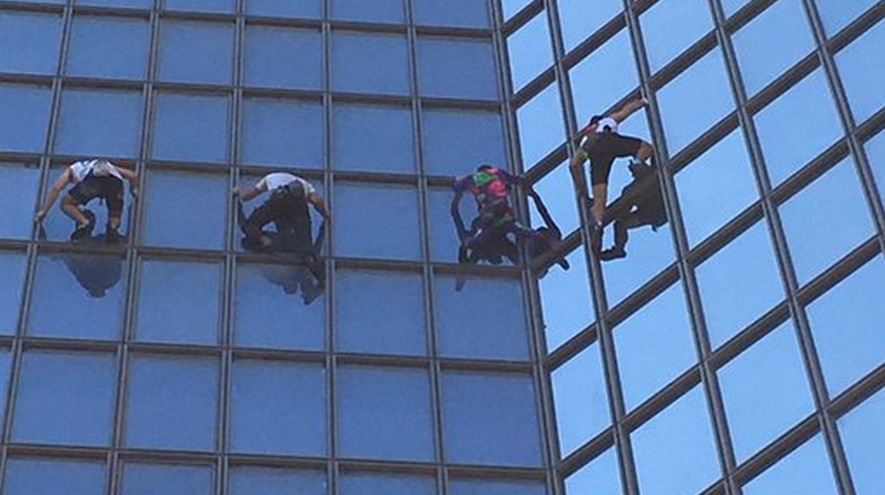 Luego del ascenso, sin equipo y con “correas” alrededor de los dedos, “el hombre araña” fue detenido y puesto bajo custodia al mediodía por “poner en peligro la vida ajena”.