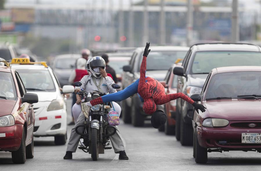 Cada semana, de lunes a viernes, Spiderman salta desde la esquina de un semáforo en Managua para rescatar su economía familiar, como buen superhéroe, se muestra sano y atlético, pero la pandemia de COVID-19 le impide constancia en su hazaña de “llevar el pan a la casa”.