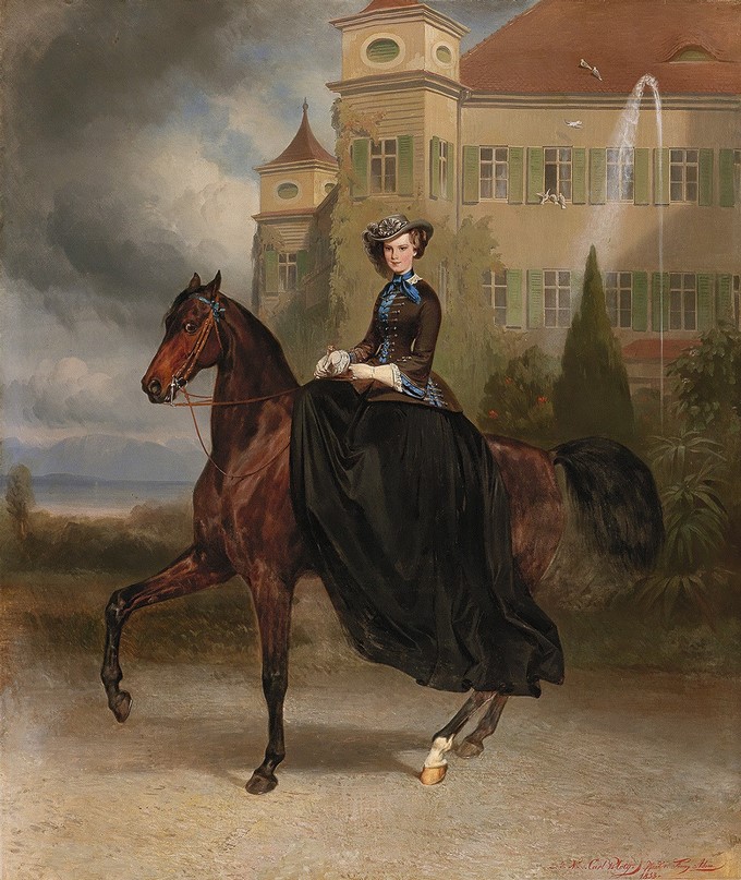 La pintura, realizada conjuntamente por los artistas alemanes Carl Theodor von Piloty y Franz Adams, muestra a la futura emperatriz de Austria y reina de Hungría montada a caballo, una de sus grandes pasiones, en su residencia de Possenhofen en Baviera.