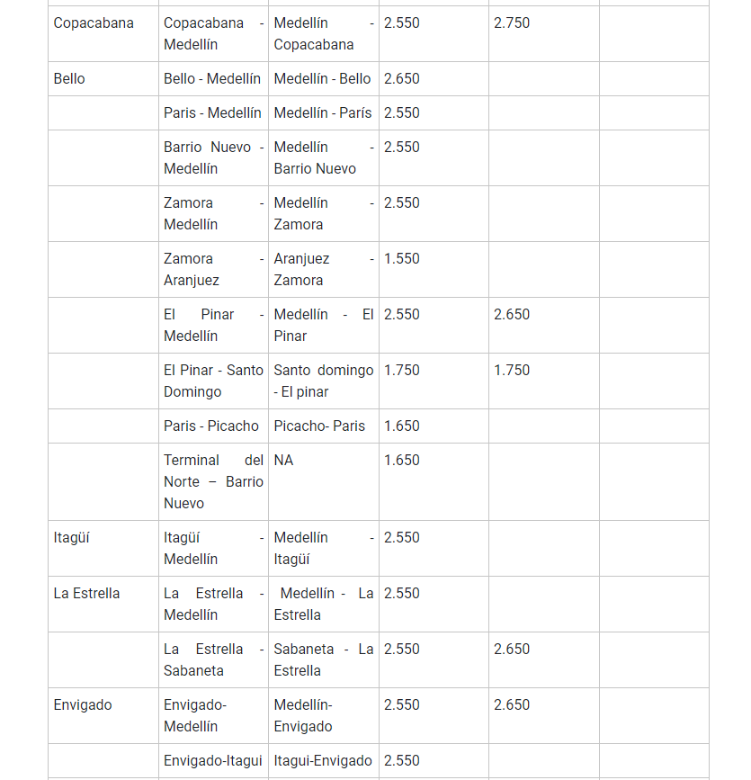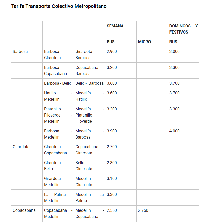 El incremento para la tarifa del sistema masivo Metro será de 150 pesos para el usuario frecuente y de 190 pesos para las rutas integradas. Para las rutas de buses y colectivos del Valle de Aburrá el incremento será de 150 pesos.