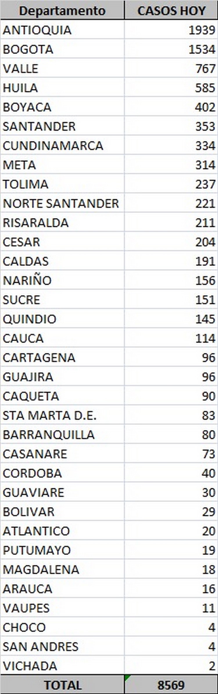 En Medellín hay 3.049 casos y los 2.001 restantes están distribuidos así en los siguientes municipios: Bello (391), Envigado (266), Itagüí (238), Rionegro (170), Sabaneta (133), Caldas (100), Copacabana (72), Girardota (65), La Estrella (59), Guarne (48), Donmatías (34), Apartadó (33), Yarumal (31), Marinilla (29), Carmen de Viboral (29), Barbosa (27), Puerto Berrío (22), Santa Rosa de Osos (18), La Ceja (17), Chigorodó (12), Turbo (12), Peque (11), Amagá (11), Carepa (11), Andes (11), Tarazá (10), El Santuario (8), Urrao (8), La Pintada (7), Segovia (6 (), Santa fe de Antioquia (5), Zaragoza (5), El Bagre (5), Santa Bárbara (5), Abejorral (4), Caucasia (4), Guatapé (4), Cáceres (4), El Retiro (4), Remedios (4), San Roque (4), Yolombó (3), Salgar (3), El Peñol (3), Necoclí (3), Liborina (3), San Pedro de los Milagros (2), La Unión (2), Concepción (2), Puerto Triunfo (2), Heliconia (2), Santo Domingo (2), Granada (2), Yondó (2), Vegachí (2), Sonsón (2), Cocorná (2), Támesis (2), Belmira (1), Betulia (1), Sabanalarga (1), San Carlos (1), Hispania (1), Briceño (1), Cisneros (1), San Vicente (1), Angelópolis (1), Entrerríos (1), San Luis (1), Fredonia (1), San Francisco (1), Sopetrán (1), Cañasgordas (1), Ciudad Bolívar (1), Dabeiba (1), Valparaíso (1), Maceo (1), Mutatá (1), San Andrés de Cuerquia (1), Gómez Plata (1), Nariño (1), Titiribí (1) y Buriticá (1).