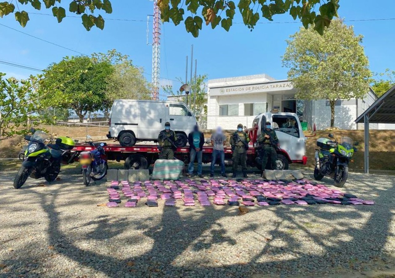 Así mismo, en la Vía Llanos del Cuiva – Taraza, en el desarrollo de actividades de registro y control a vehículos y a personas, fueron capturados dos hombres y aprehendido un adolescente de 17 años de edad, quien se movilizaba como conductor de una motocicleta, en calidad de escolta. De un vehículo tipo súper Carry que transportaba mediante modalidad caleta 175.5 kilos de marihuana, empacados en 04 bultos y 02 cajas de cartón. El capturado fue dejado a disposición de la Fiscalía General de la Nación por el delito de fabricación, tráfico y porte de estupefacientes.